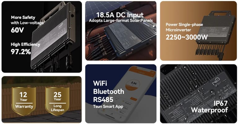 TSUN TITAN microinverter 2250W-3000W is a high-power microinverter specially designed for high-power photovoltaic systems and can meet users' power needs in larger-scale systems. The microinverter provides stable, efficient energy conversion and is suitable for commercial and household photovoltaic applications requiring high power output. With advanced inverter technology, TITAN microinverters can significantly increase the overall output of the solar system, maximize the energy conversion efficiency of each panel, and help users achieve more stable and efficient power production. TSUN TITAN micro-inverter has a powerful power output, is suitable for the integrated use of multiple battery panels, and provides users with greater system expansion space. The microinverter is not only capable of handling high-power load demands but also supports parallel configuration to accommodate expanding system scale. In practical applications, its high-power design means that the microinverter can effectively support a wide range of photovoltaic power needs, thereby providing users with a long-lasting and stable supply of renewable energy. For users looking to achieve high power self-sufficiency through solar systems, the high power output of TITAN microinverters will significantly reduce dependence on the grid.